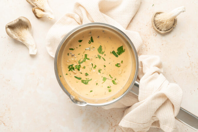 - Voeg als laatste de mayonaise en de sherry door de saus. Roer dit goed door en gebruik eventueel een garde.