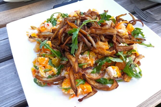- Voeg de rucola toe en schep de gebakken oesterzwammen over de fruit-kip salade