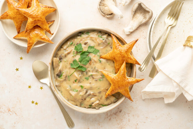 Serveer de bladerdeegsterren met een royale lepel oesterzwammenragout erbovenop. Geniet van deze heerlijke, feestelijke lekkernij!