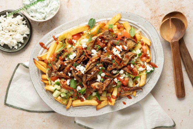 - Verdeel de ijsbergsla, tomaten en komkommer over de friet. Verdeel hier de oesterzwammen over. Garneer met de resterende dille en munt, en verkruimelde feta. Serveer met de tzatziki.